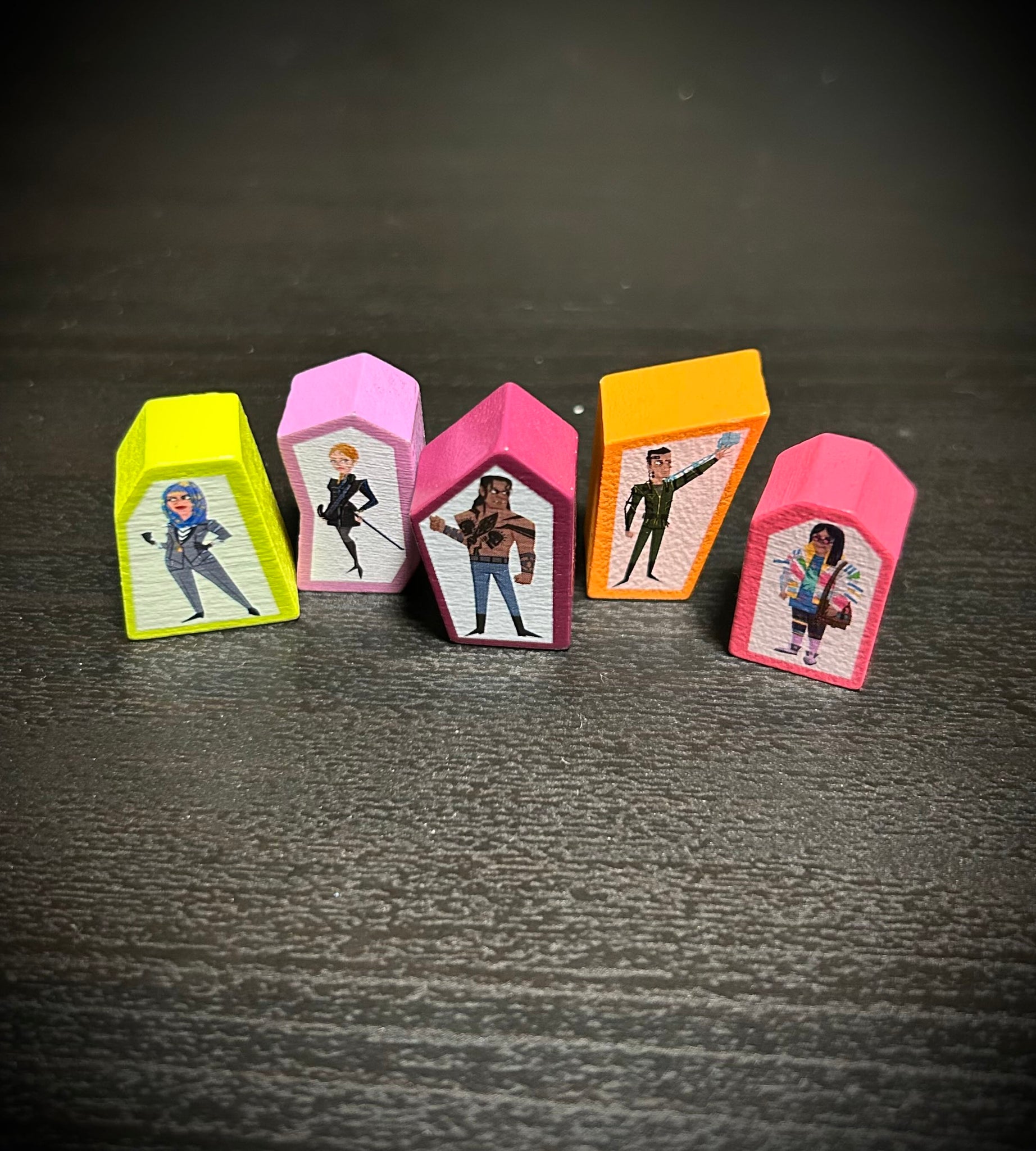 5 new characters to play pulled right from the Netrunner universe. Each one comes with a two unique thematic powers - one for their disguised mode, and one for their geared mode on the back side of their card. Each side has custom artwork. The also have a special tool card to use when the time is right. They each have a custom wood token, heat transfer printed on both sides!